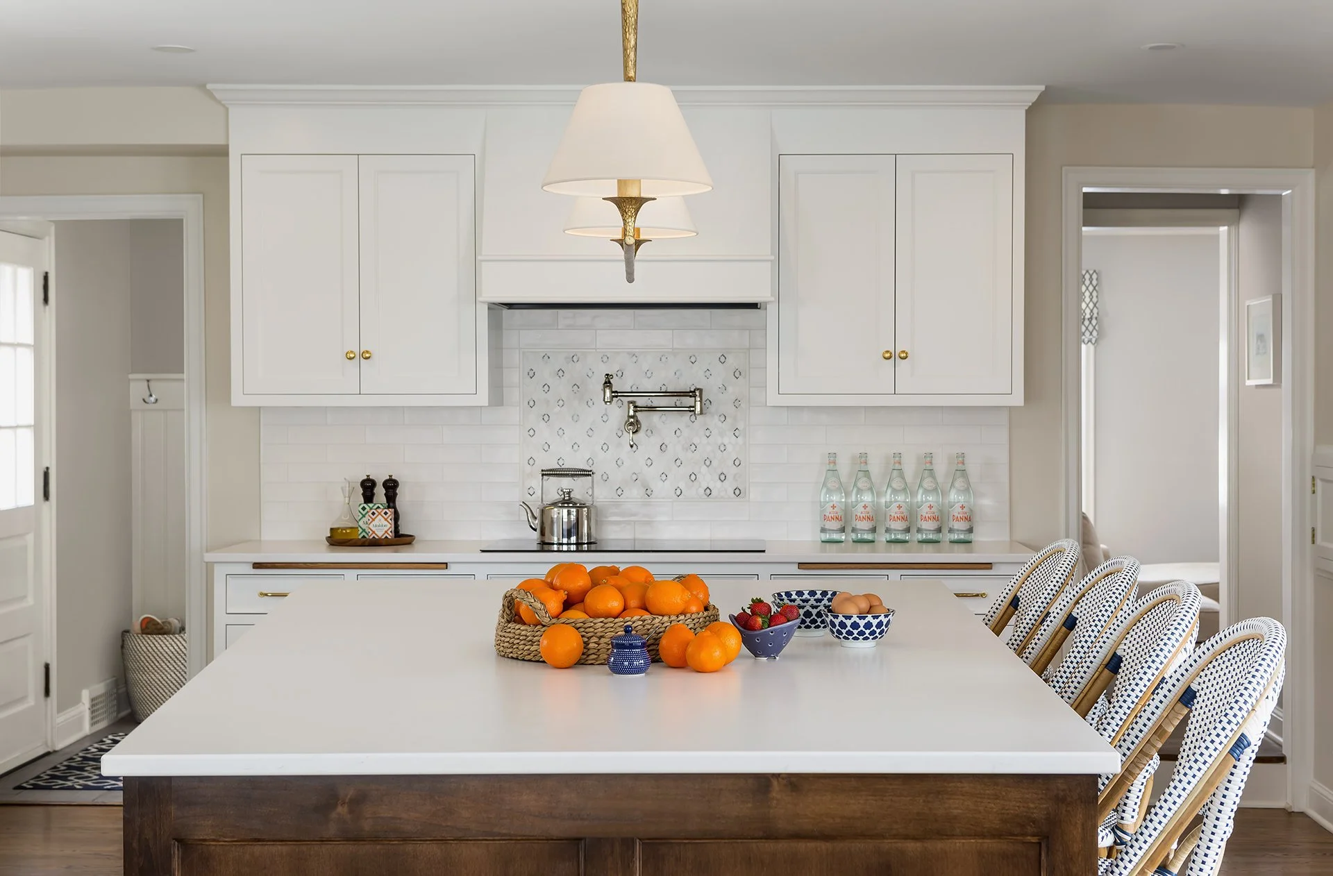 Crisp white cabinetry combined with blue and brass accents set the tone for this newly remodeled transitional kitchen and tie it to the rest of the home.
